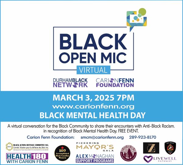 Join us online on Zoom for a conversation with the Black Community sharing encounters with Systemic Racism through Poetry, Music, Personal Storytelling, reflecting on inspirational quotes from Black leaders and a Healing Activity led by culturally responsive Psychotherapist/ Social Worker who share healing strategies, techniques or processes that help participants decompress what they’ve learned and talked about. Have your voice heard or listen. No Cost. Limited Capacity. Register Now to secure your spot. All welcome! Funded by: Alex Monaghan Mental Health Programs & Pickering Mayor's Gala.