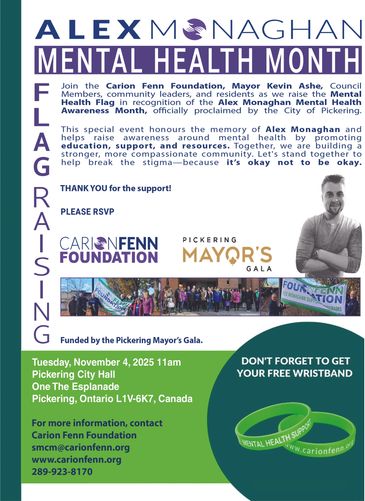 Join us, City of Pickering Mayor Kevin Ashe & Council, Community Members as we raise the Alex Monaghan Mental Health Flag in recognition of November 2025 as "Alex Monaghan Mental Health Month" increasing awareness, provide support, resources for promoting Best Mental Health.